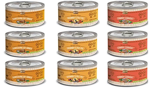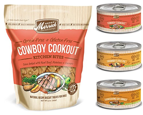 Includes 3 cans of Grammy's Pot Pie, 3 cans of Cowboy Cookout, and 3 cans of Thanksgiving Day Dinner (9 Cans, 3.2 Ounces Each) PLUS a 9-ounce bag of Merrick Grain Free Kitchen Bites Cowboy Cookout Dog Biscuits -- 10 Items Total