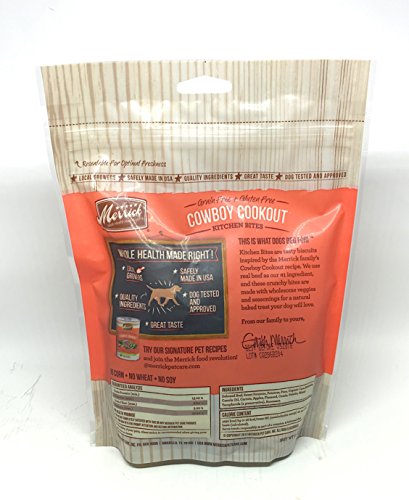 Merrick Grain Free is an all-natural canine diet with deboned meat as the first ingredient. Recipes feature quality protein, with farm-fresh fruits and vegetables like sweet potatoes, blueberries, peas and more. Industry-leading levels of omega 6 and omega 3 fatty acids aid in a healthy skin and coat for dogs, and powerful levels of glucosamine and chondroitin foster healthy hips and joints.Merrick Kitchen Bites are all-natural, oven-baked biscuits based on Merrick's innovative and award-winning classic can recipes. They also start with real deboned meat as the #1 ingredient for a single source of high quality protein, then fresh fruits and vegetables, for a crunchy and healthy treat for dogs. Unlike many biscuits that include rice, flour or wheat, Kitchen Bites are grain free and gluten free.