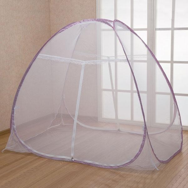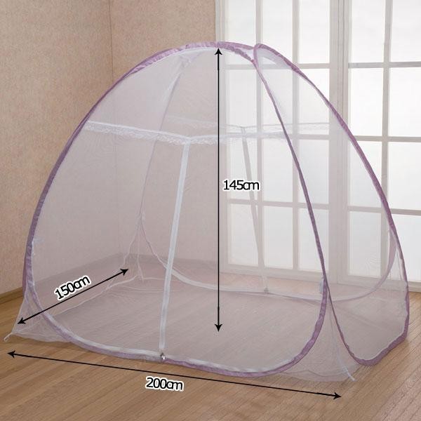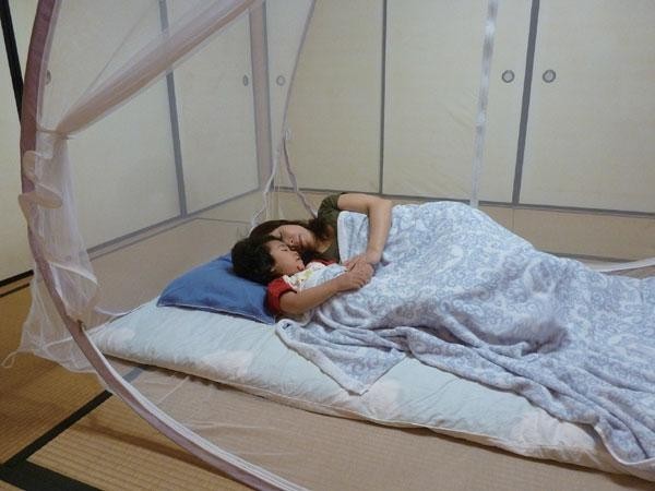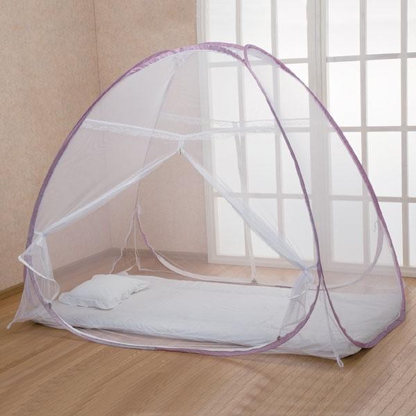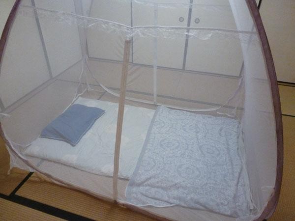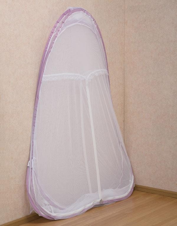 | 袋から取り出し、ポーンと広げるだけでテント型の蚊帳になります。底面にもネットが張ってあり、ムカデからも守ります。 |