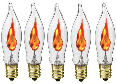Studio : Creative Hobbies Publisher : Creative Hobbies Product Description Creative Hobbies® A101 Unique Flame Shaped small light bulb flickers with a soft orange glow like a real candle flame! These flicker-flame candelabra base bulbs have an orange glow that flickers and dances up and down the flame shaped filament. They look great in holiday projects, in electric candles, chandeliers, or as accents in various small craft projects. These bulbs measure only 2-1/2 inch long overall and have a small candelabra base (approx 1/2 inch diameter). Low wattage saves energy and gives ambiance and not bright light (only 3 watts). Petite size fits many applications like window candles, sconces, chandeliers (only 2.5" overall). Candelabra Base (E12 night light size) with nickle plated screw base for corrosion resistance. This offer is for 5 brand new flicker flame bulbs for one low price. 0