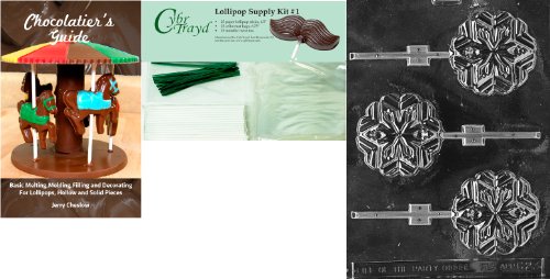 Cybrtrayd Snowflake Lolly Chocolate Mold with Chocolatier's Bundle of 25 Lollipop Sticks, 25 Cello Bags, 25 Green Twist Ties and Chocolatier's Guide