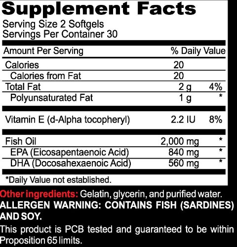 Our highly concentrated, proven Pharmaceutical Grade Omega-3 Fish Oil delivers an unrivaled 800mg of EPA and 600mg of DHA/2 capsules! You would have to take up to 6 or more capsules of other brands to even come close to that level.