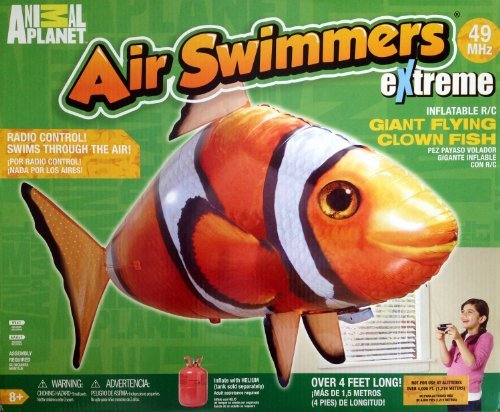 Fly the giant-sized clown fish around your home or office and make it swim through the air, go left and right with ease. Air Swimmers Extreme Giant Flying Clown Fish is able to turn in very small spaces, so it can easily swim around and bounces off walls and other objects without damage. The Remote Control Air Swimmer Flying Clownfish comes complete with everything you need to fly it (including batteries), except for Helium. You will need to fill the Air Swimmer with Helium before it will fly. There are 2 options for obtaining this Helium either buy a helium canister and fill up the Air Swimmer in your own home or take the Air Swimmer to a Helium supplier (party shops, florists). The huge, floating, helium-filled flying fish is back. The Air Swimmers Extreme Giant Flying Clown Fish comes with a remote-controlled handset that puts you in control. Fly the Clown Fish up to 50', up and down stairs and around your house in any direction using the motorized mega fin. The Giant Clown Fish bounces of walls and other objects without causing any damage. Each Air Swimmer is made from ultra-durable nylon, which means it can stay aloft for weeks at a time. Its one-way valve allows for easy filling, emptying, and re-filling.Feature