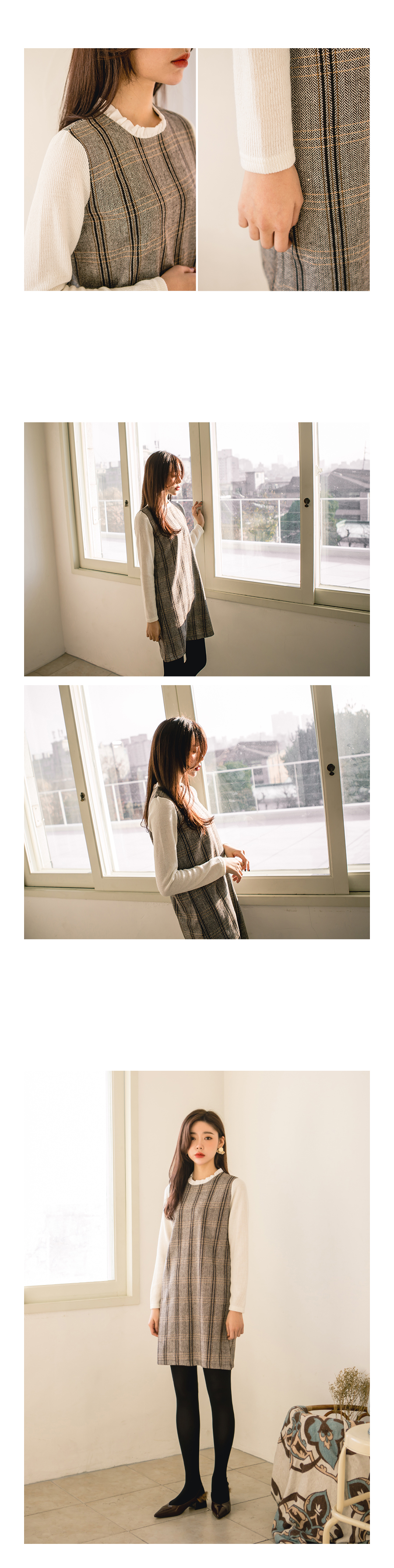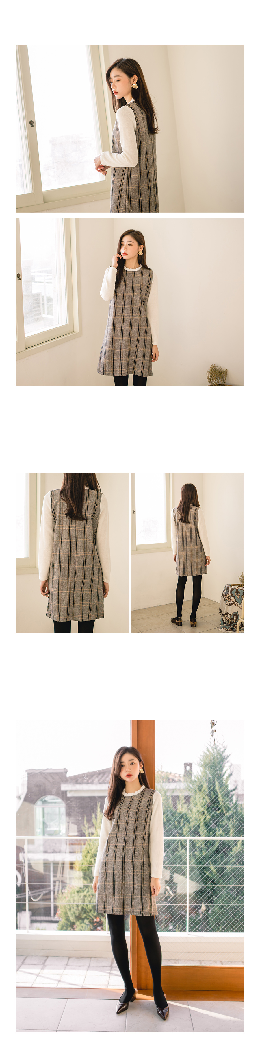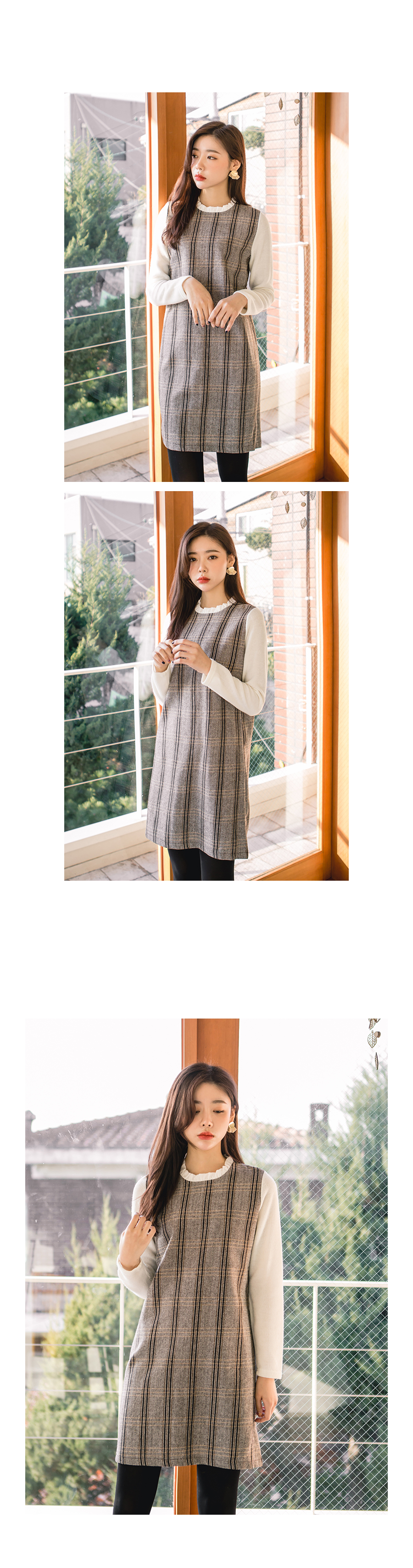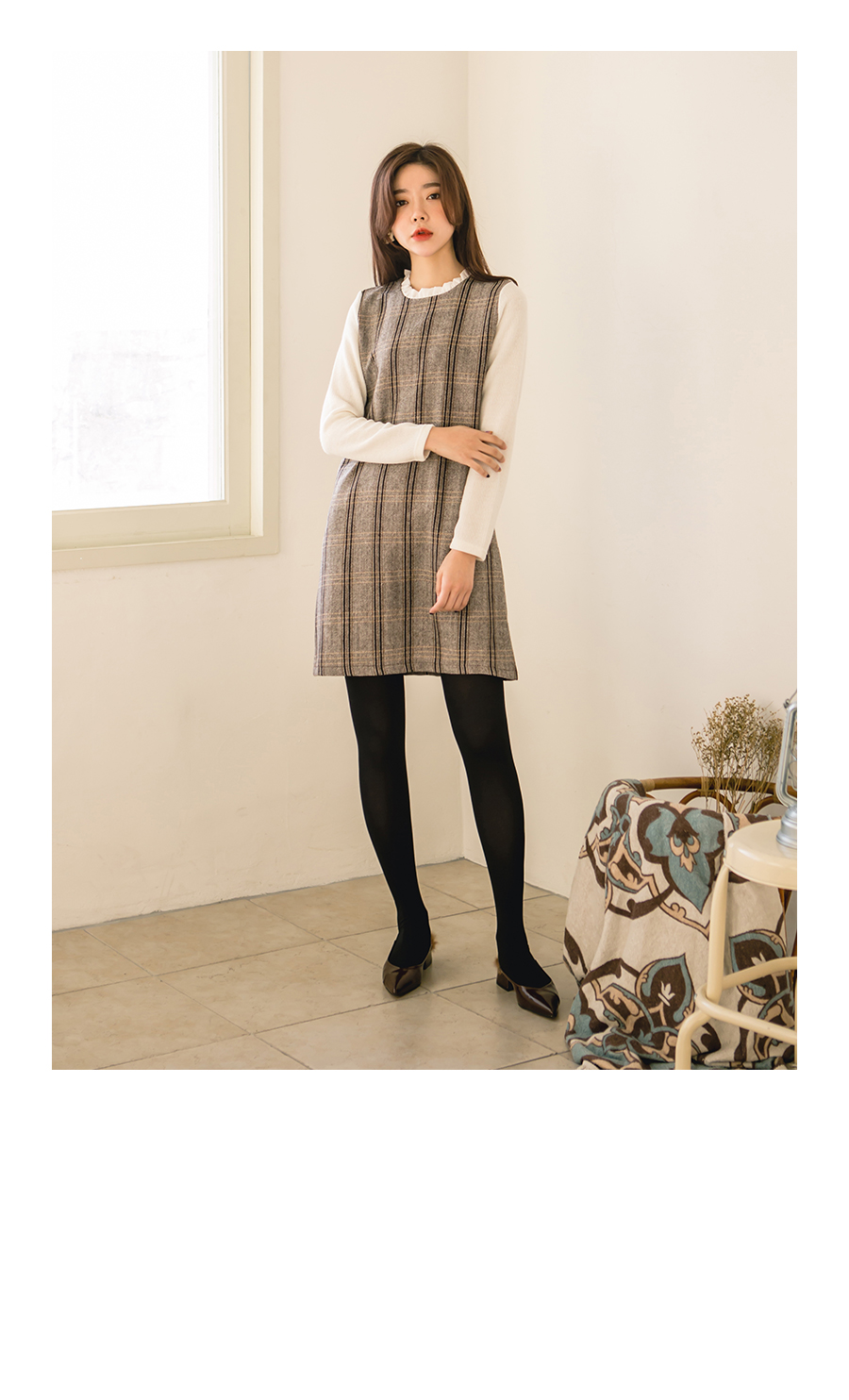 잔잔한 체크패턴으로 고급스럽고 네크라인에는 프릴배색으로