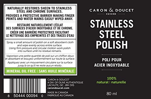 -. Binding : Health and Beauty -. Brand : Caron Doucet Cuisine -. EAN : 0850444006997 -. Feature : A premium stainless steel cleaner and polish made with 100% plant based ingredients such as refined coconut oil and essential oils. This polish will remove fingerprints effortlessly and will leave your stainless steel looking clean and shiny without the harshness of corrosive agents. / Unlike other products on the market we do not use any corrosive or harsh chemicals in our products so this one is 100% safe around children and food. You will not need to worry about the safety of your family as our stainless steel polish and cleaner is derived from 100% plant based ingredients. / This stainless steel cleaner and polish does not contain any water and is a very concentrated solution. This small bottle will last for ages as you only use a tiny amount. This will save you money in the long run compared to other diluted solutions on the market. / This product comes with an easy to use pump spray that dispenses a tiny amount each time. For the best results we recommend using the same microfiber cloth that comes with the product only for the stainless steel polish. This way once the cloth is saturated you only need to use the cloth to touch up, saving you money! / Comes bundled with a black microfiber cloth that grabs dirt and cleans without scratching. Product can safely remain on cloth between uses so touch ups are a breeze. -. IsAdultProduct : 0 -. Label : Caron Brands Inc -. Manufacturer : Caron Brands Inc -. Model : ACD004B -. MPN : ACD004B -. PackageQuantity : 1 -. PartNumber : ACD004B -. ProductGroup : Health and Beauty -. ProductTypeName : HEALTH_PERSONAL_CARE -. Publisher : Caron Brands Inc -. Studio : Caron Brands Inc -. Title : Caron & Doucet - 100% Natural Stainless Steel Polish Bundle: 2 Items; 1 Stainless Steel Polish, 1 Black Microfiber Cloth -. UPC : 850444006997
