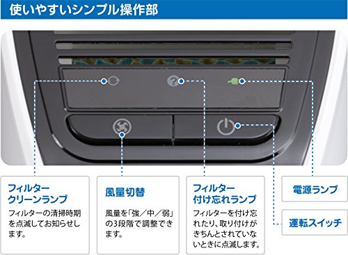 운반을 할 수 있는 편리한 콤팩트크기. 세척 수 있고몇 번이나 반복해 사용 할 수 있는집 진플레이트. 사용하기 쉽은 심플한 조작부.(풍량3 단교환)
