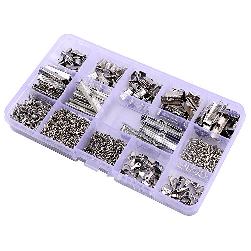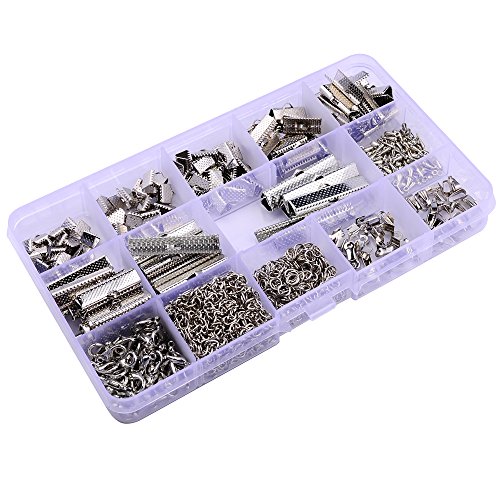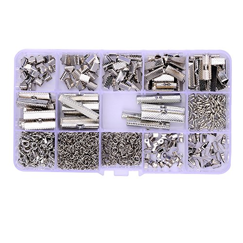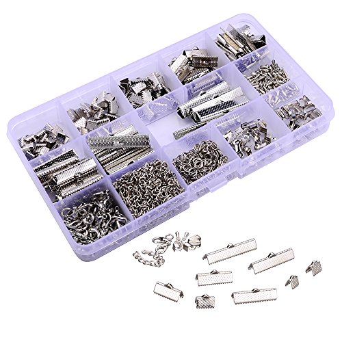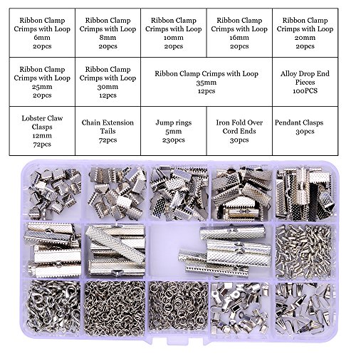 144 Pcs Ribbon Clamps 8mm 10mm 16mm 20mm 25mm 30mm 35mm and 72 Pcs Lobster clasps 12mm 230 Pcs jump rings 5mm 72pcs chain extension 100 Pcs Alloy Drop End for Jewelry findings (PLATINUM PLATED)