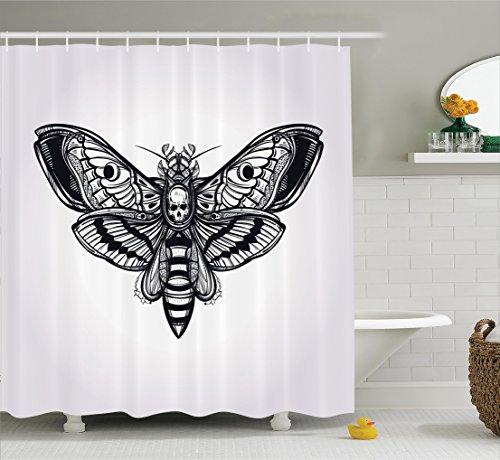 Ambesonne Skulls Decorations Collection, Dead Moth with Skull Face in Gothic Grunge Style Dark Butterfly Inner Self Journey, Polyester Fabric Bathroom Shower Curtain Set with Hooks, Black White