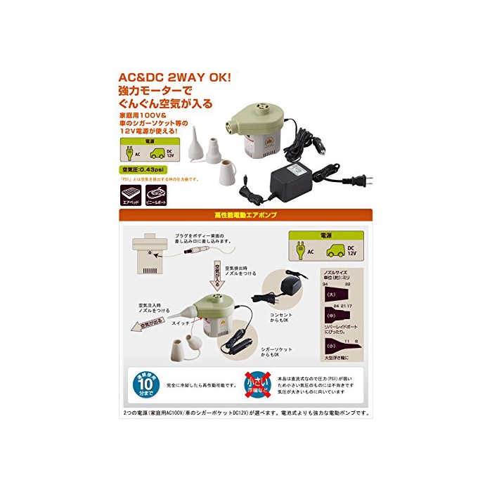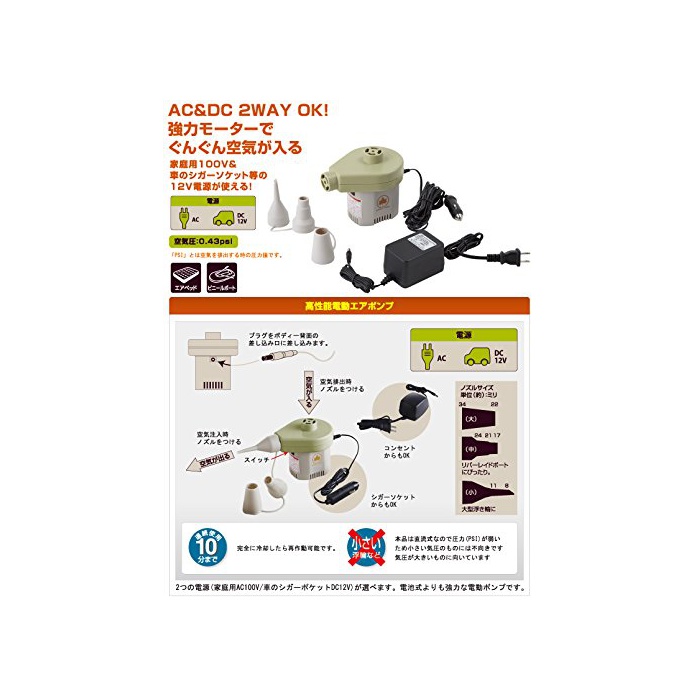 원본상품명: ロゴス エアポンプ AC/DC2電源パワ?ブロ?(0.43PSI ) 81336591