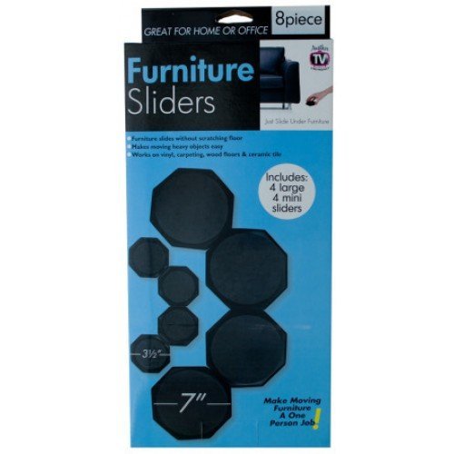 -. Color : Black -. EAN : 0785983737210 -. Feature : Though furniture is comfortable to sit on, it can do destruction to floors. Moving the furniture to / Protects floors from furniture legs / Allows furniture to slide with ease. One person can push heavy furniture / One person can push heavy furniture. Works on vinyl, carpeting, wood floors and ceramic tile / Included: Four (4) Large furniture sliders, Four (4) Small furniture sliders -. Label : Destinie -. Manufacturer : Destinie -. ProductGroup : Home Improvement -. ProductTypeName : HARDWARE -. Publisher : Destinie -. Studio : Destinie -. Title : 8 Piece Furniture Sliders Set - Great For Home or Office -. UPC : 785983737210