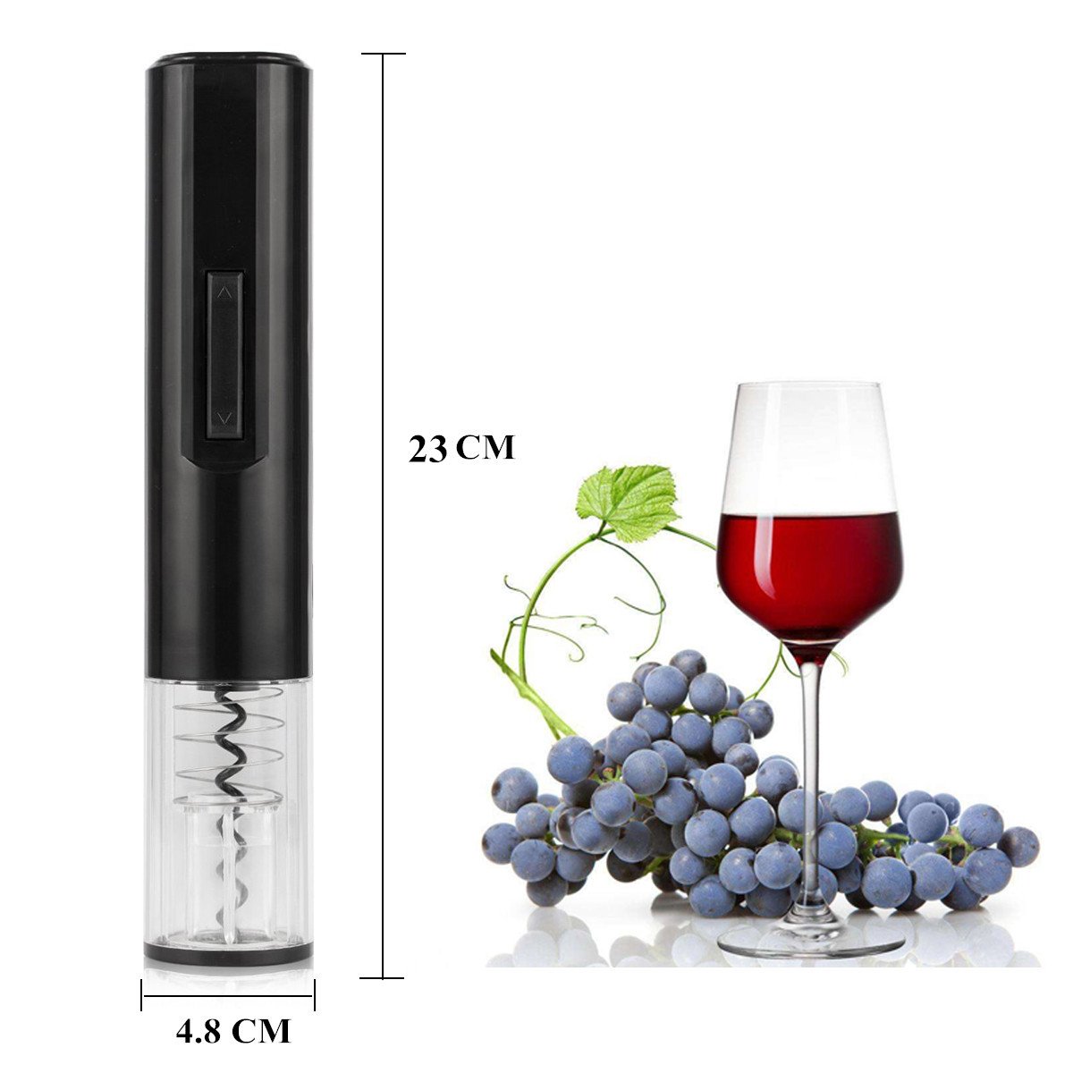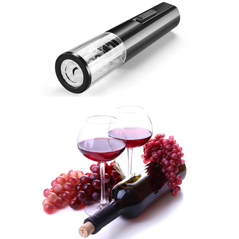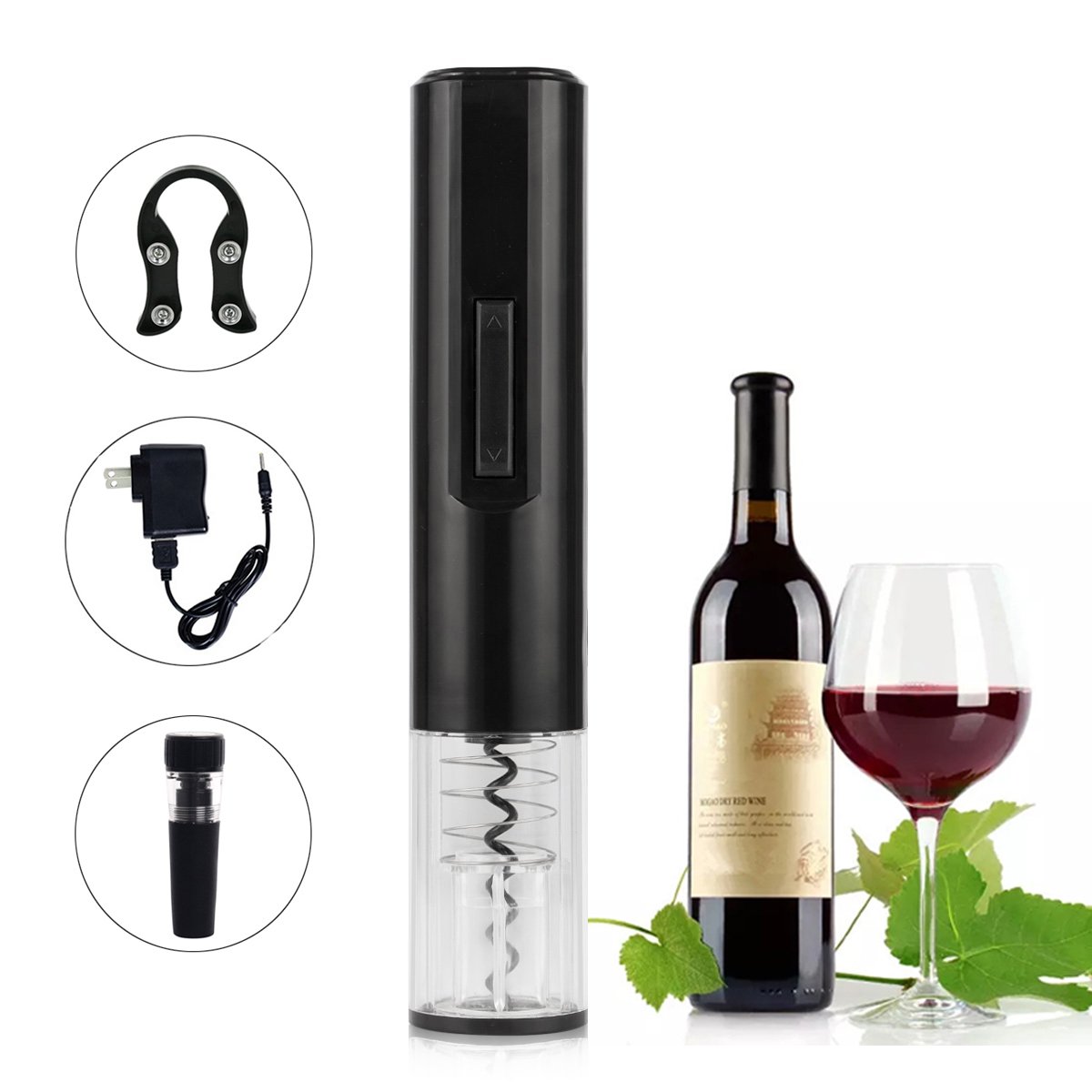 Includes: electric wine opener, charger, wheel cutter, vacuum bottle stopper, instructions.