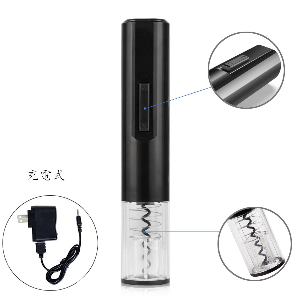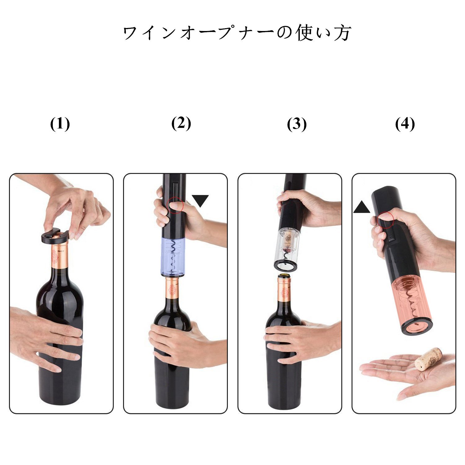 Pushing the lower switch turns the screw and pulls out the cork while screwing the screw into the cork.