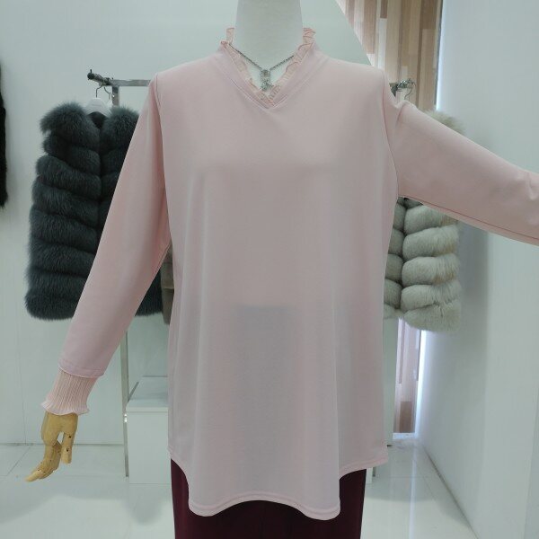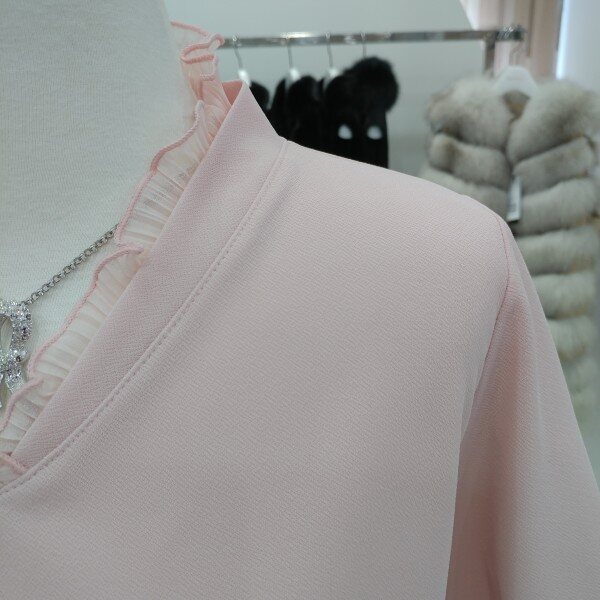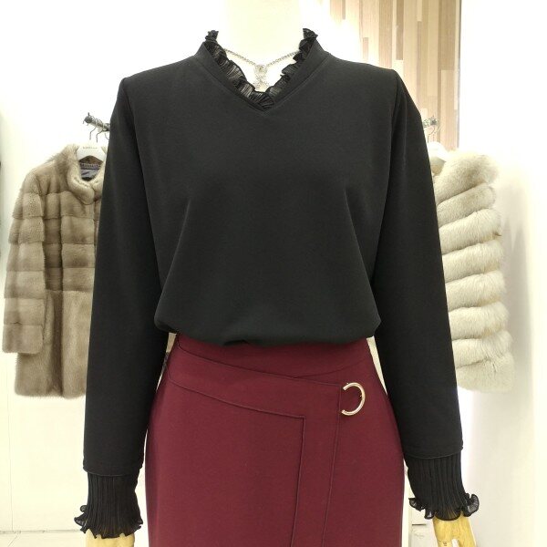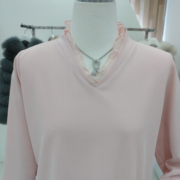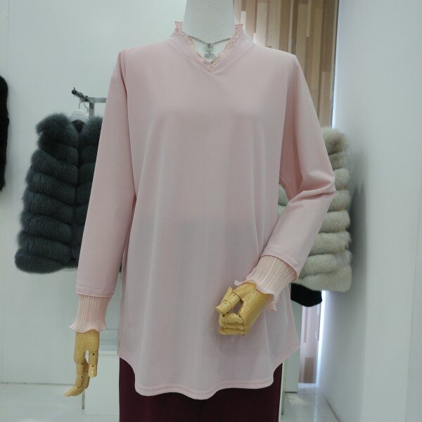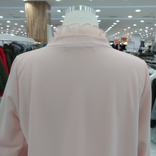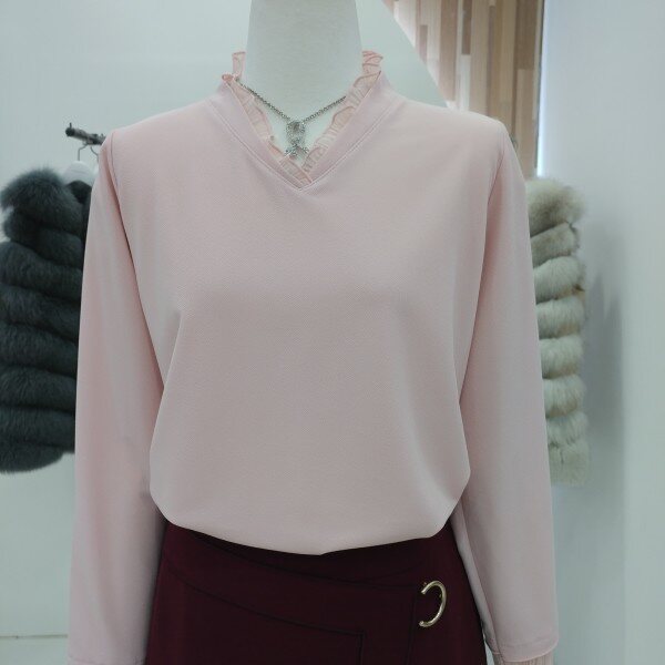 네크라인을 감싸는 브이라인에 프릴디테일을 가미하여 페미닌한 무드를 느끼게 해드립니다