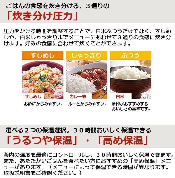 ごはんの食感を炊き分ける、3通りの「炊き分け圧力」や、30時間おいしく保温できる「うるつや保温」・「高め保温」など、たくさんの機能を搭載しています。 |