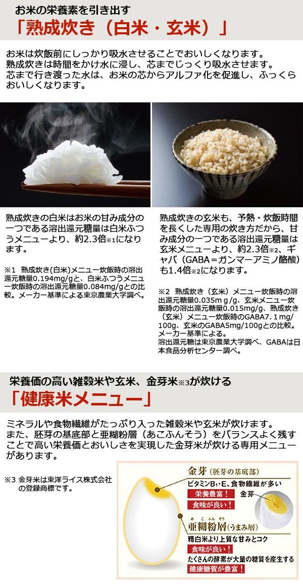 | 仕様 | 電源:交流100V・50/60Hz 炊飯容量:0.09~0.54L(0.5~3合) 電源コード:1.0m(コードリール付き) 最大炊飯容量区分:A(電磁誘導加熱方式(IH)0.54L以上0.99L未満) |