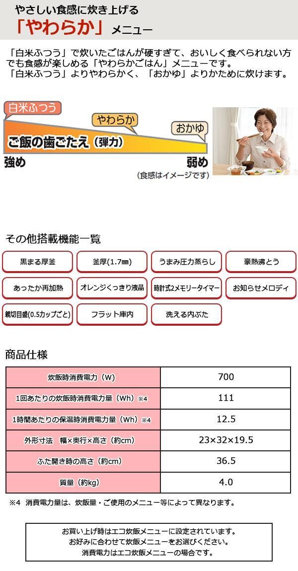 | 付属品 | しゃもじ、しゃもじ受け、計量カップ(白米用・無洗米専用)、取扱説明書兼保証書(保証期間:1年間) ※取扱説明書に「お料理ノート」ページあり |