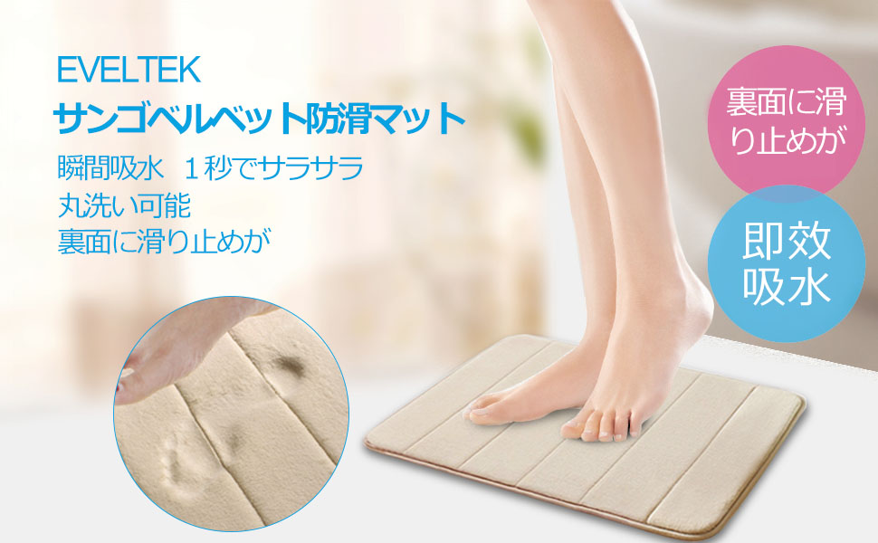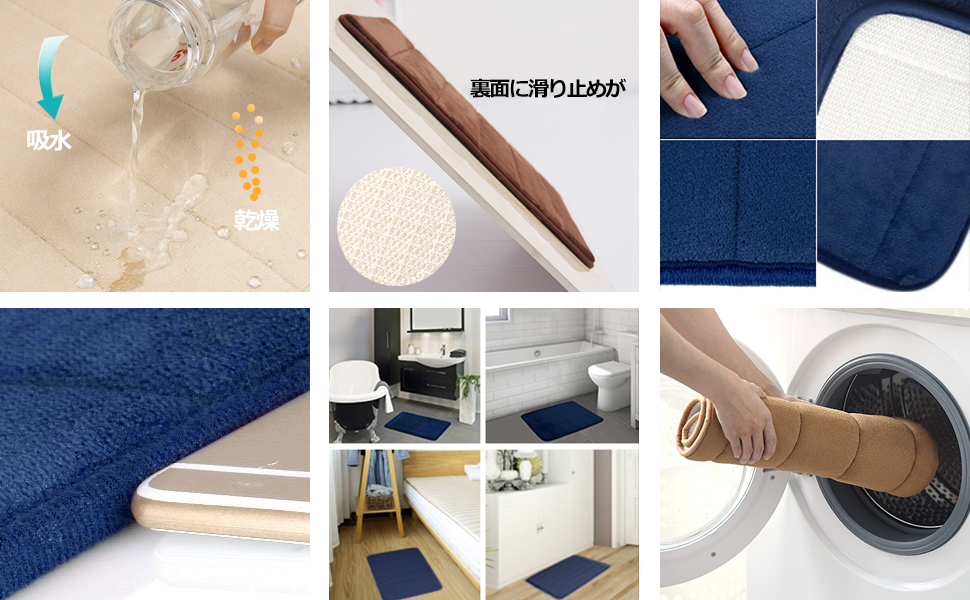 速乾:中材 ウレタンフォーム、メモリーフォームが通気性に優れ、ふかふかの踏み心地と共に、抜群の速乾性を実現。バスマット表面が常に乾燥状態となり、雑菌やカビなどの繁殖が防げます。