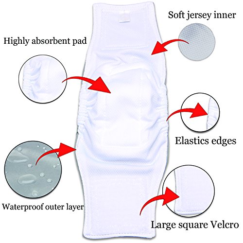 Comfortable and Durable Fabric Luxja male dog diapers are made of high quality material. ●The breathable and soft jersey inner is smooth to your dog's skin. ●Highly absorbent double-layer pads are sewn into for absorbing urine much more easily. ●Waterproof outer layer is great to prevent leaks. ●Neat stitches and premium fabric make these diapers more durable.
