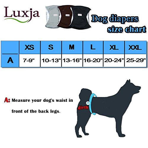 Suitable Size Please measure your dog's waist in front of the back legs. (PS. The size of our dog diaper may be different from other brands) XS: 7-9 inches S: 10-13 inches M: 13-16 inches L: 16-20 inches XL: 20-24 inches XXL: 25-29 inches