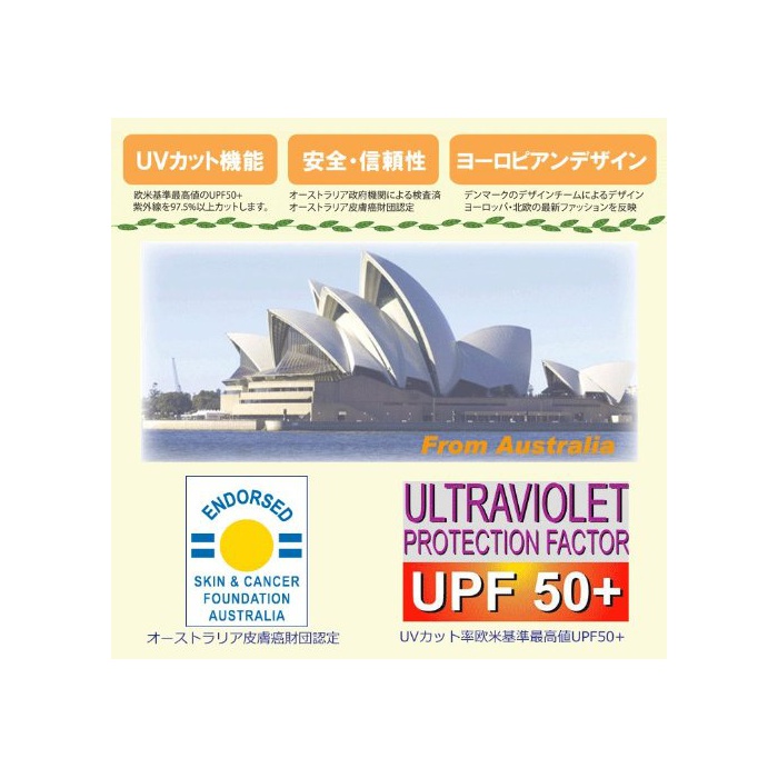 자외선 (UV) 컷율: ARPANSA(오스트레일리아 보건성 방사능 보호 핵 안전국)의 정하는 규격으로 최고가의 UPF50+.이UPF50+ 그러면,자외선 (UVA 및 UVB)의 97.5%이상을 컷 합니다.UPF란,1992년에 오스트레일리아에서 의류가 자외선을 차단하는 효과를 수치화 한 기준으로 최고 기준이 50+입니다.뉴질랜드 미국 등도 이 기준을 채용 하고 있습니다.