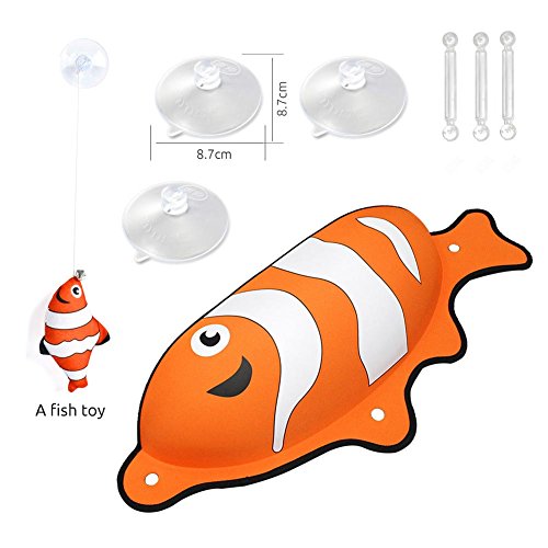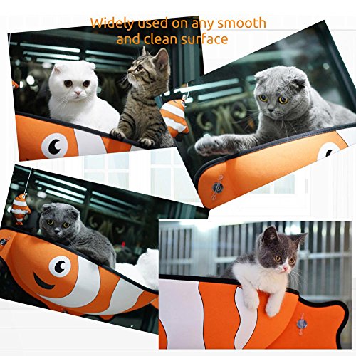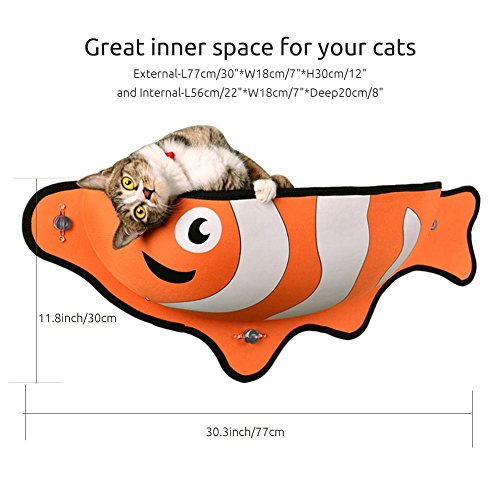 Product Features: Product Overall Dimensions: 30" x 7" x 12" ( L x W x H ) Product Inner Dimensions: 22" x 7" x 8" ( L x W x H ) Suction Cup Diameter: 3.3" Weight: 1.5 pounds Materials: EVA Polyester Contents: 1 x window mounted cat perch 3 x PVC suction cups sliding bar 1 x free fish shape cat toy
