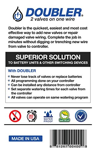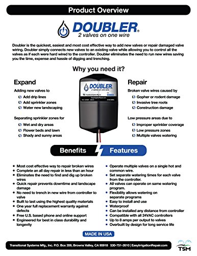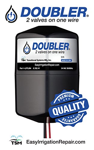 -. Brand : TSM, Inc. -. Color : Black -. EAN : 0851267004009 -. Feature : Operates 2 sP.R.Inkler valves independently on one set of field wires / Most cost effective way to repair broken wires / Bypass broken sP.R.Inkler valve wires - No need to trench in new wires from controller to valve / Quick repair prevents downtime and landscape damage / Easy to install - Completely waterproof -. Label : Transitional Systems -. Manufacturer : Transitional Systems -. Model : Doubler -. MPN : DOUBLER - 2 valves on one wire -. PackageQuantity : 1 -. PartNumber : DOUBLER - 2 valves on one wire -. ProductGroup : Lawn & Patio -. ProductTypeName : OUTDOOR_LIVING -. Publisher : Transitional Systems -. Studio : Transitional Systems -. Title : DOUBLER - 2 Valves on One Wire / Expand or Repair Your Irrigation System with Ease -. UPC : 851267004009 -. Warranty : One Year Limited Warranty
