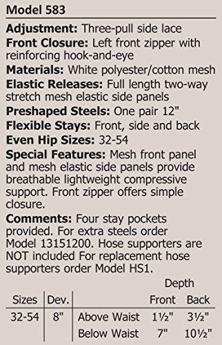 -. Feature : Women's Lumbosacral Support / Three-pull side lace -- Zipper closure / Development: 8" / Front height: 8-1/2" -- Back height: 14" / Even hip sizes: 32, 34, 36, 38, 40, 42, 44, 46, 48, 50, 52, 54