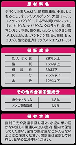 原材料:チキン、小麦たんぱく、動物性油脂、小麦、とうもろこし、米、シリアルブラン、大豆ミール、フィッシュパウダー、ミネラル類(カルシウム、リン、カリウム、ナトリウム、クロライド、鉄、銅、マンガン、亜鉛、ヨウ素、セレン)、ビタミン類(A、D、E、B1、B2、パントテン酸、B6、葉酸、B12、コリン)、酸化防止剤(ミックストコフェロール)