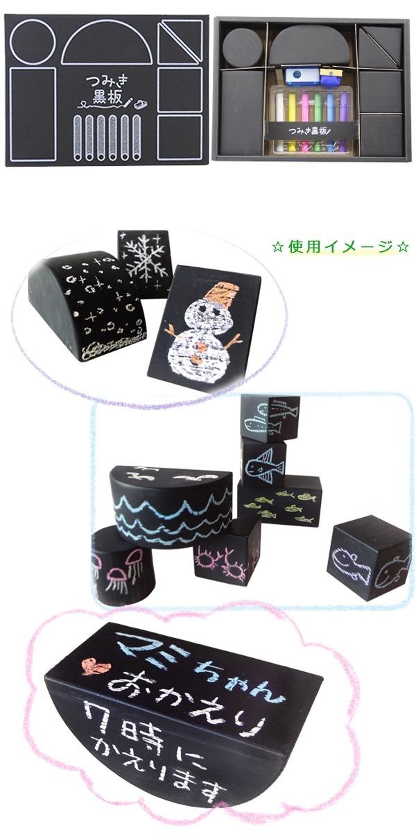 | 素材・材質 | つみき:間伐材、チョーク:炭酸カルシウム、黒板拭き:再生プラスチック・発泡材・布 |