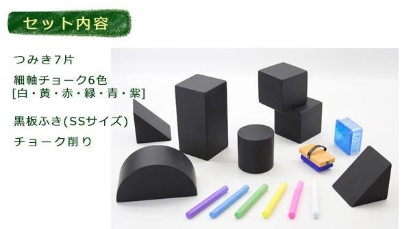 | セット内容 | つみき7片、細軸チョーク6色(白・黄・赤・緑・青・紫)、黒板拭き(SSサイズ)、チョーク削り |