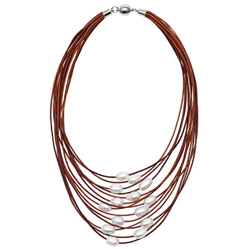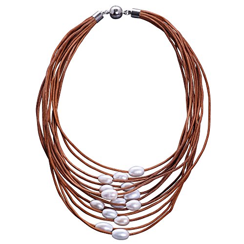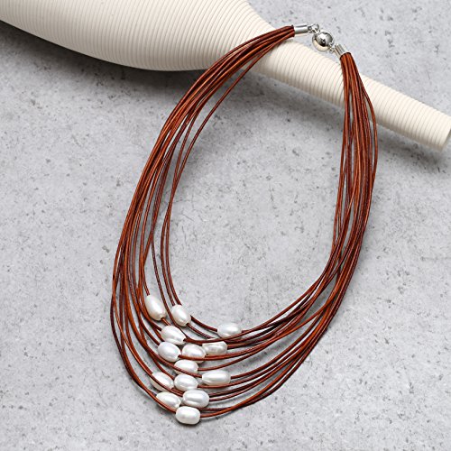 Handmade Freshwater pearls leather Strand necklace with white rice pearls, 3 colors of leather cord to choose