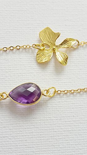 -. Title : 24K gold plated flower and pear shape amethyst stone with little dragonfly charm, chain bracelets set