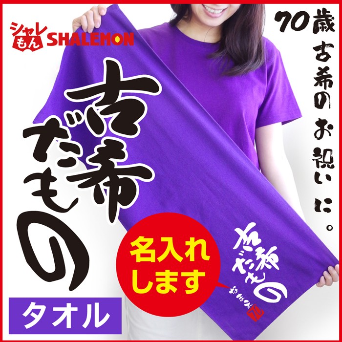 「古希だもの」デザインが最高!シャレもんオリジナル古希祝い用タオルです。もちろん高品質でしっかりとした厚手生地で実用性抜群です。名入れ可能ですので、プレゼントされる方のお名前を入れてみよう! サイズはフリーサイズ・一般的なタオルサイズです。 名前の文字は白文字、書体は筆文字となります。文字数は8文字(ひらがな・カタカナ・漢字)まで名入れいたします。 他にもご長寿祝い商品が数十種ありますので、当店シャレもんの長寿祝いコーナーをご覧ください。きっと、笑顔になる還暦祝いはシャレもん!!