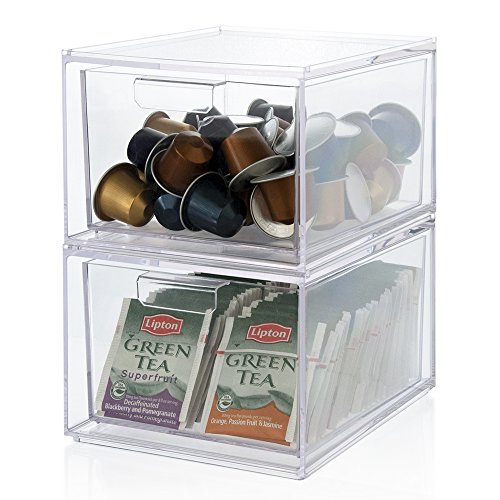 -. Feature : THE PERFECT STORAGE DRAWER! Great size for coffee pods, tea bags, stirrers and other beverage necessities. / STACKABLE! Drawers can be used side-by-side or stacked to save space. Fits perfectly next to any coffee machine. / SAFE AND STURDY! This durable material is a safer and better alternative to glass and looks great in any kitchen decor. / EASY TO USE! Great for storing small packets that get lost easily - taco seasoning, hot chocolate, even carry-out ketchup and soy sauce packets! Each drawer is removable for easy access and refilling. / MADE IN USA! Made of durable BPA-free material. Each drawer measures 6"L x 7-7/8"W x 4-1/2"H Inside drawer dimensions: 5-1/8"L x 6-5/8"W x 3-1/2"H
