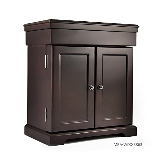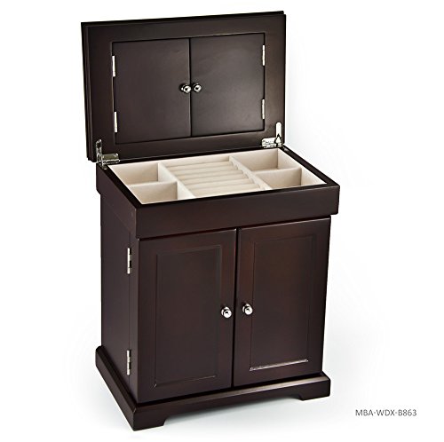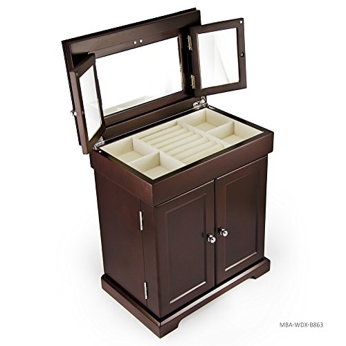 Studio : MusicBoxAttic Publisher : MusicBoxAttic Binding : Kitchen Product Description Tune: 18 note movement (please see above for available song titles) Sophisticated Modern Dark Espresso Grand Musical Jewelry Box with Silver Hardware Exterior: Matte espresso finish/ raised panel accents Interior/upper: Lift up lid with incredible concealable vanity mirror with 3 mirror panels Interior/upper: 4 open compartments with huge center ring rolls Interior/sides: 2 large side compartments w/ necklace holder (2 hooks each side) Interior/center: 5 large drawers with dividers used in 2 of 5. Wood/Materials: wood, painted finish, all lined in plush beige fabric Polished silver finished hardware Dimensions: 13"x 11.5"x 7.5" 0