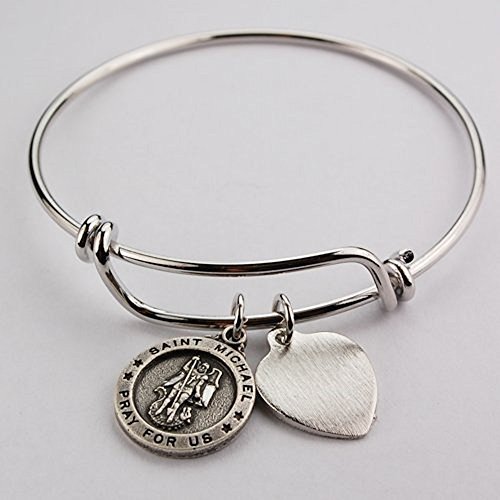 -. Title : Womens Catholic Bracelet, Religious Bracelet, Silver, Adult Dangling Patron Saint, Round St. Michael the Archangel Charm Medal with Heart Charm, Pewter Faith Bangle 2 3/4" Diameter. Catholic Saint Michael the Archangel Patron Saint of Battle, Emt's, Mariners, Sailors, Seafarers, Paratroopers, Radiologists, Airborne, Grocers, Paratroopers, Police Officers, Death, Policemen, Military.