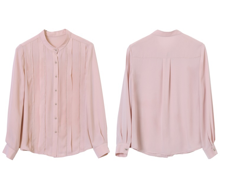 シルバーカラーの小さめボタンとピンタックに沿ってあしらったラインがポイントの