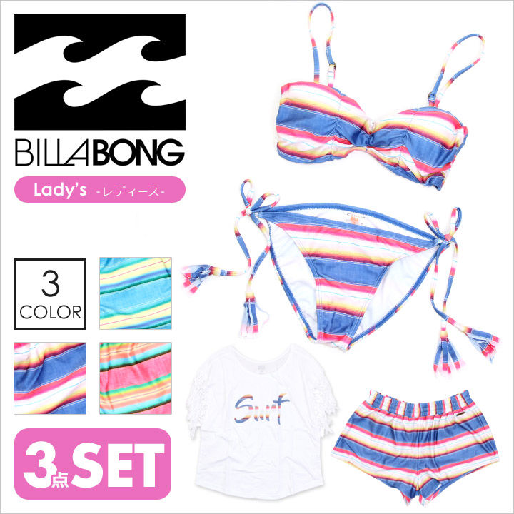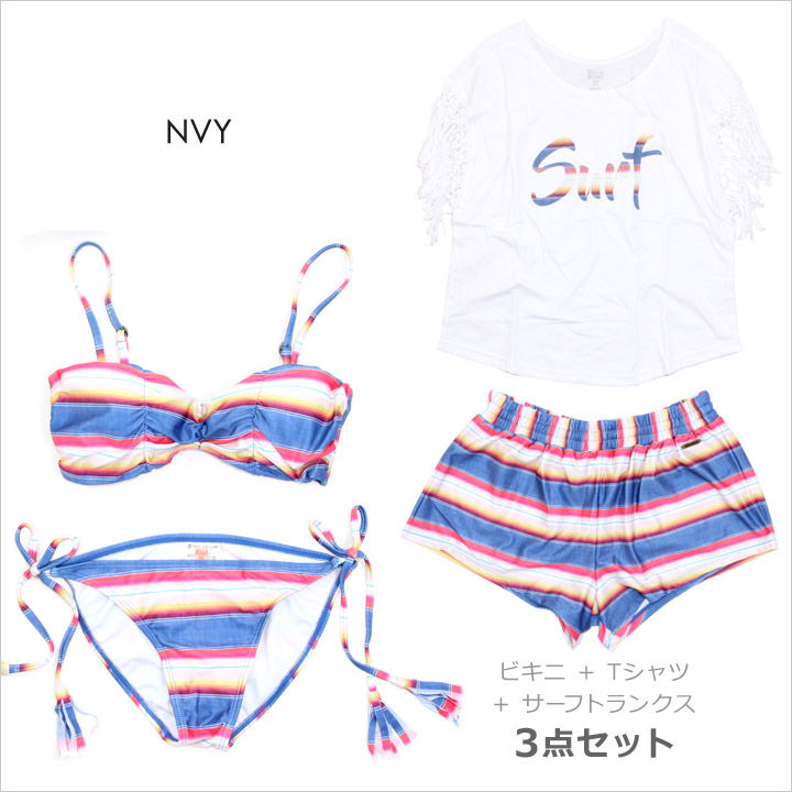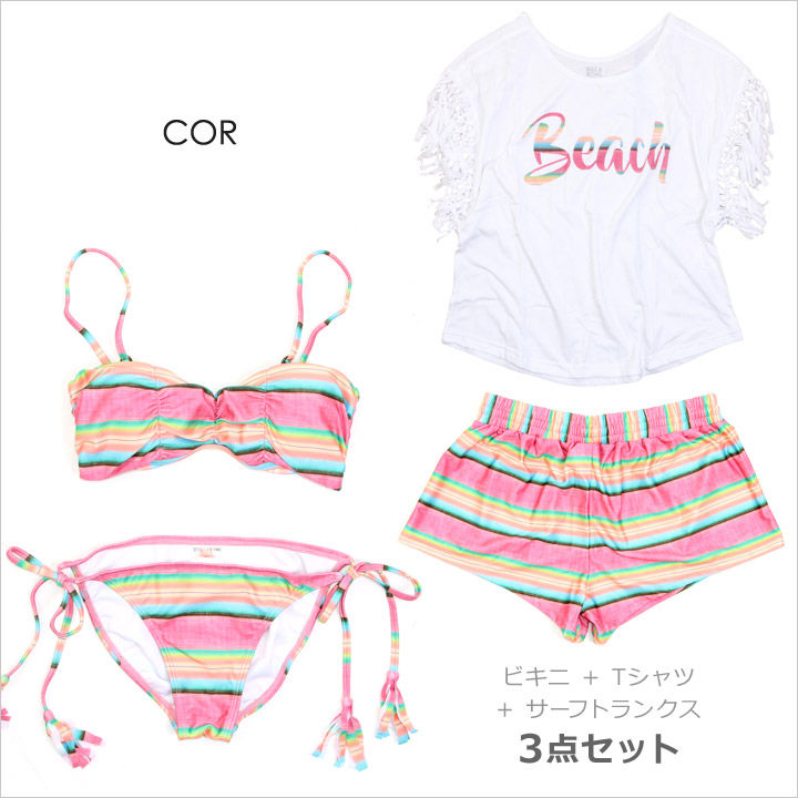 マルチボダーバンドゥビキニに、Tシャツと水着と同柄のサーフトランクスがついたお得な3点セット。ビキニのストラップは取り外し可能で、3タイプの着こなしが楽しめるお得なアイテムです。ビキニトップはワイヤーカップとサイドボーン、内蔵カップでバストをしっかりとホールドし、バックのアジャスターで三段階のアンダーバストの調節が可能。ビキニボトムのサイドリボンはフェイクタイプなので、万が一解けても安心です。肌を大胆に見せるコンパクトなシルエットで、大人の色気を醸し出しつつ、胸元のシャーリングが女の子らしさをアピールしてくれます。セットのTシャツは透け感のある薄手のT/C天竺素材を使用し、フロントに"Surf"のメッセージを配し、袖に施されたデザインフリンジがアクセントになっています。スイムショーツは吸水速乾性を備えた水着と同素材を使用し、ストレッチ性に優れ、滑らかな肌触りで着心地も抜群です。