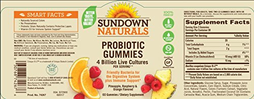 Sundown Naturals Probiotic Gummies are a delicious way to take your probiotics. These naturally flavored pineapple, raspberry and orange flavored gummies provide friendly bacteria for your digestive system. Our Probiotic Gummies have over 4 billion live cultures per serving. At time of manufacture.Feature