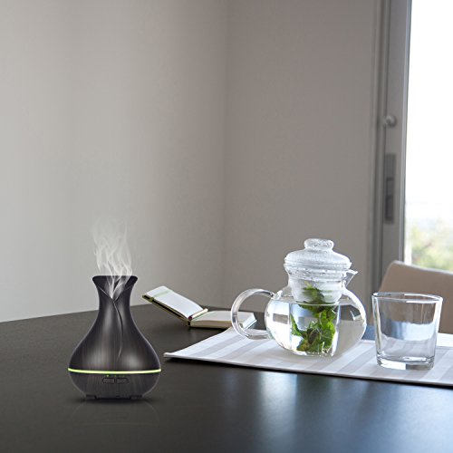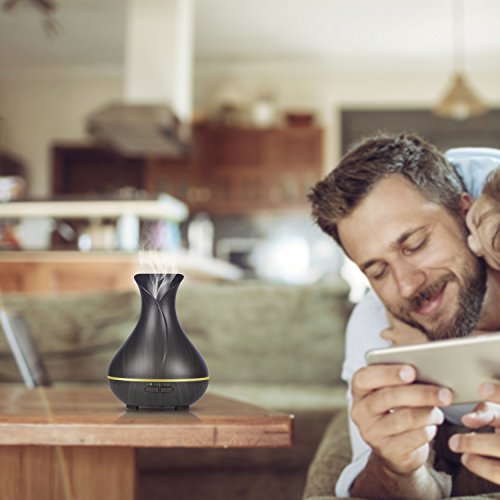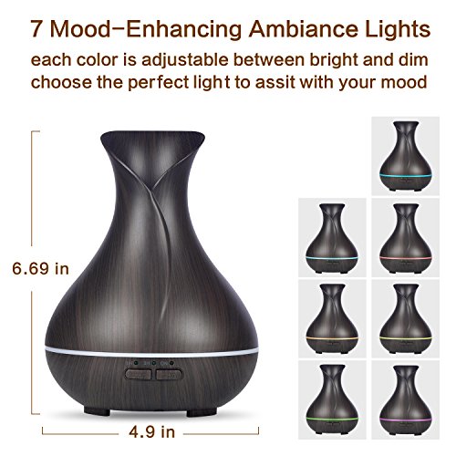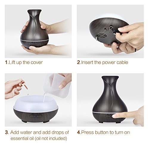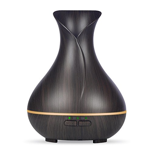 -. Feature : Unique Design:With flower vase design and classic wood grain finish, makes this aroma diffuser high-grade,looks beautiful.add drops of your favorite essential oil to give your room a fresh, clean scent.it will fill your space with lovely fragrance.as a decorative piece,perfect for any décor. / 7 Soothing LED Light:The color can be cycled through or set it to one fixed color. each color has two light options: dim and brighter.soft light creates a calming and romantic atmosphere.also a perfect nightlight for baby room. / Timer Settings and Auto Shut off: 3 time setting modes: 1H/ 3H/Continuous modes. it produce up to 25-30ml of moisture per hour,it can runs up to 4-6 hours of continuous output.diffuser automatically powers off when water runs out. / Super Quiet:Adopted ultrasonic technology, this ultrasonic diffuser is extremely quiet when working. it gives out ultra fine and smooth mist which can soften and moisten dry and chapped skin in winter. it also helps you breathe better when your are sleeping with air conditioner on. / Premium Quality Materals:This aromatherapy diffuser made of BPA free materials.ultra-high grade, safe, and eco-friendly PP materials,the same as baby bottles are made from.45 Days Money Back and 18 Months Warranty.