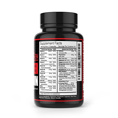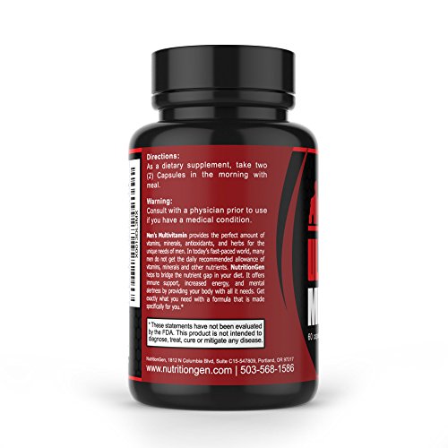-. Binding : Health and Beauty -. Brand : NutritionGen -. EAN : 6464372367064 -. Feature : BOOST ENERGY AND FOCUS - NutritionGen's Multivitamin Supplement for Men increases your energy and mental alertness with natural energizers without caffeine. A powerhouse blend of green tea, pomegranate fruit, and other ingredients for optimal health and energy levels for active men. / SUPPORTS PROSTATE AND HEART HEALTH - Support the health of your prostate and heart with our targeted nutritional supplement which meets men's special needs. Our formula also helps you with macular degeneration, asthma, and arthritis symp so you get a complete solution. / PROTECT IMMUNE SYSTEM - Protect your immune system and fight off disease, sickness and exhaustion so you feel great while enjoying your active lifestyle. Our immune and antioxidant blends contain natural boosters such as Echinacea, Garlic, and Beta Glucan to enhance your overall health and well-being. / MADE IN THE USA - Our easy to swallow veggie capsules are proudly made in the USA in an FDA registered facility which follows strict GMP guidelines. This ensures the safest and most accurate product for you. / 100% SATISFACTION GUARANTEED - Your satisfaction is our top priority, therefore, we offer a 90-Day Money-Back Guarantee. If you are not completely satisfied with your purchase of our multivitamin supplement for men, you get a full refund. Read more information in the product description below. -. IsAdultProduct : 0 -. Label : NutritionGen -. Manufacturer : NutritionGen -. MPN : 004 -. PackageQuantity : 1 -. PartNumber : 004 -. ProductGroup : Health and Beauty -. ProductTypeName : HEALTH_PERSONAL_CARE -. Publisher : NutritionGen -. Studio : NutritionGen -. Title : Ultra Power Multivitamin - Natural Vitamin Supplement For Energy, Prostate and Heart Health - Dietary Multivitamin Supplement - 60 Capsules