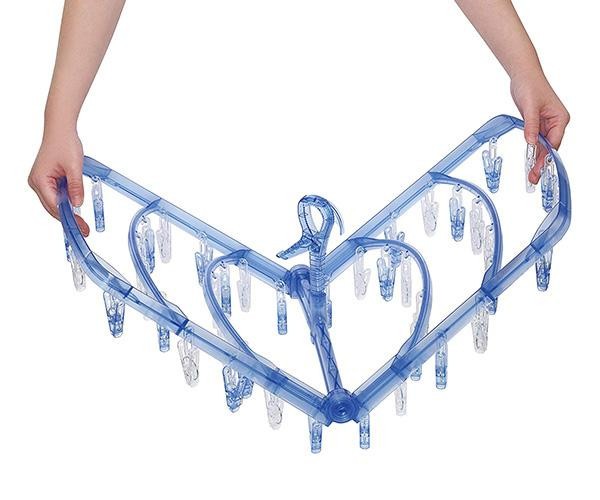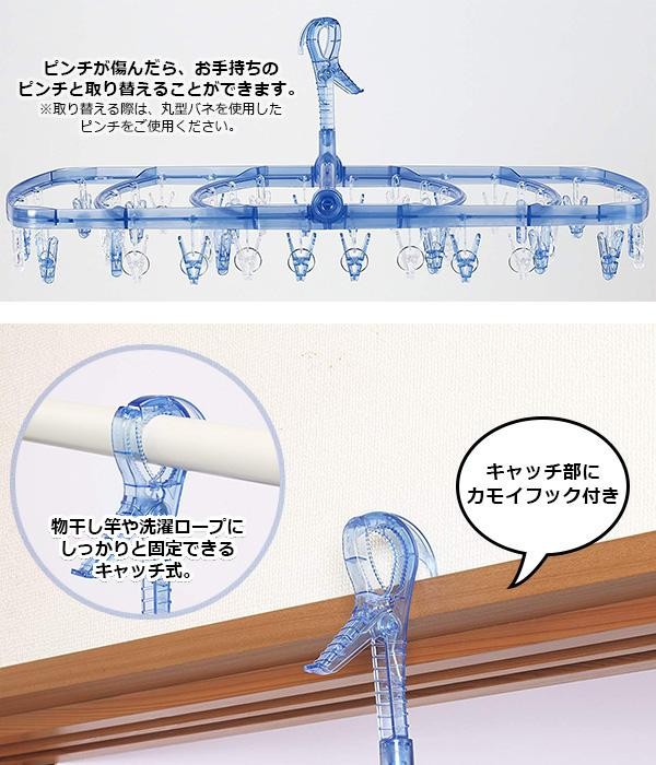 工業用プラスチック素材「ポリカーボネート」ですべての樹脂部分ができています。チェーンやワイヤーが無いので、ピンチの絡みを低減。ピンチあとが残りにくい細かな凸面構造になっています。ピンチが傷んだら、お手持ちのピンチと簡単に交換できます。 |