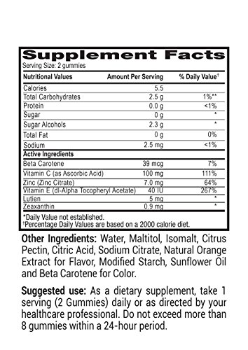 Our eye care gummy supplement contains all those vitamins and minerals, and in addition it also includes lutein and zeaxanthin which are known for their macula-protecting properties against the sun's UV damage.