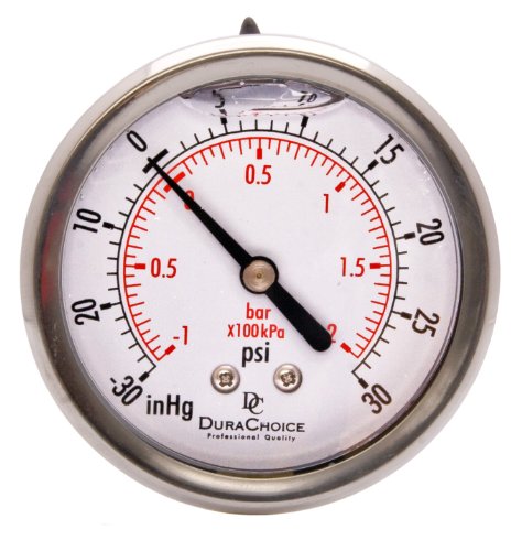 2-1/2" Oil Filled Vacuum Pressure Gauge - Stainless Steel Case, Brass, 1/4" NPT, Center Back Mount Connection -30HG/30PSI