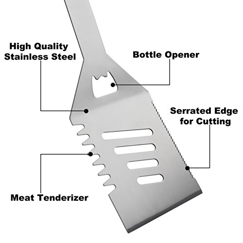 - PRODUCT FEATURES: Stored and carried conveniently with luxury aluminum storage case - Hanging hook for convenient placement when not in use - With a built-in bottle opener, a serrated edge on both sides in slotted spatula - Grill cleaning brush comes with brass bristles and scrapper to total clean