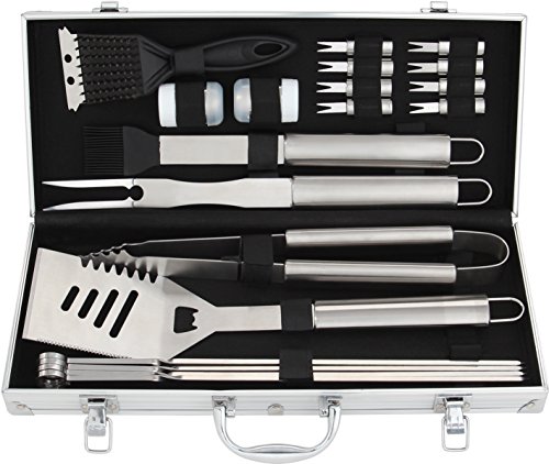 - COMPLETE BARBECUE SET: Great set for the grilling fanatic covering all that you need to get right into grilling, set includes 4-in-1 spatula, fork, superior-grip tongs, silicone basting brush, 4 kabob skewers, 8 corn holders, salt&pepper shaker, aluminum storage case, grill cleaning brush.