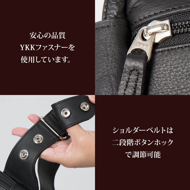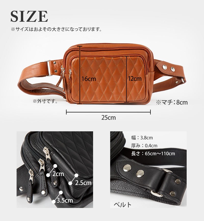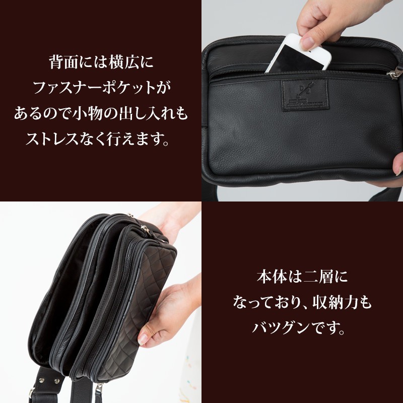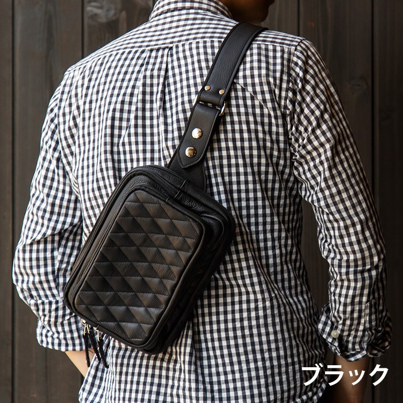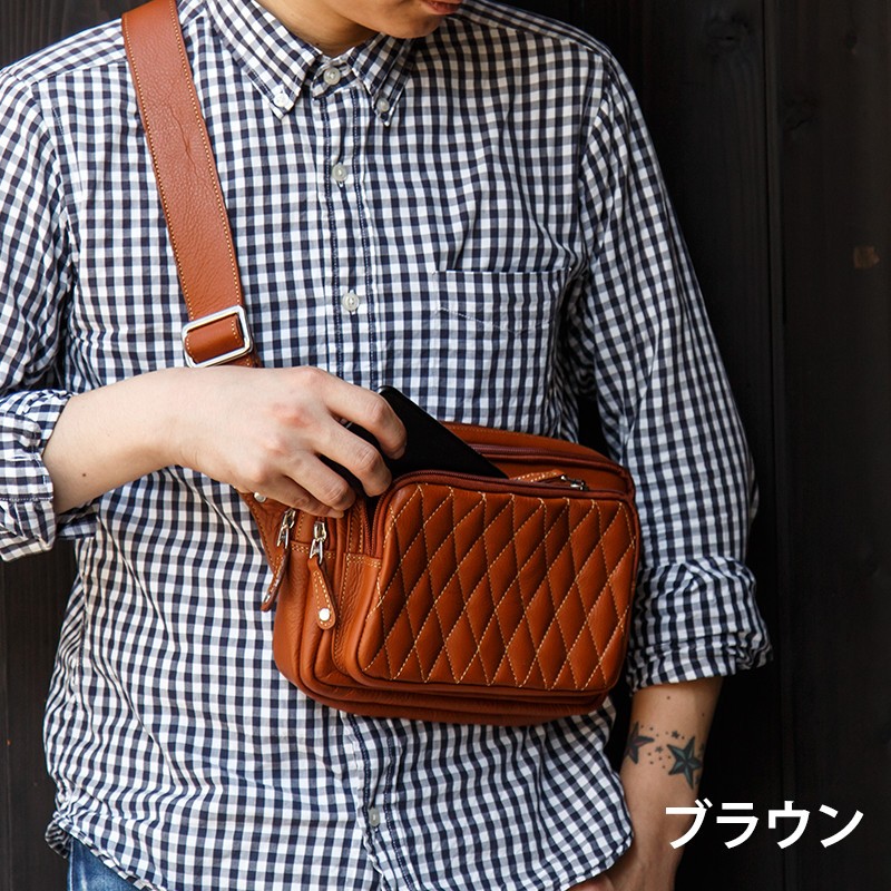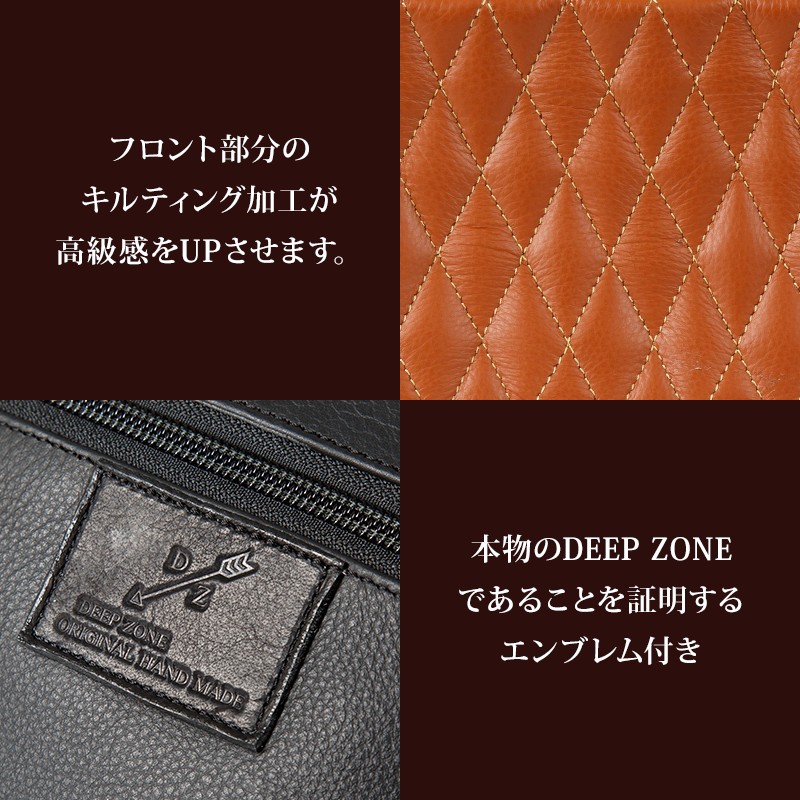 【素材】 牛革 内側:牛革/ナイロン(裏地) 【サイズ】高さ:約16.0Cm 幅:約25.0Cm マチ:約8.0Cm(2.5Cm+2Cm+3.5Cm)【カラー】ブラウン・ブラック【仕様】ポケット×5 (メイン×1 前面×2 内部×1 背面×1)     ベルト:幅約3.8cm 厚み約0.4cm 長さ約65cm~110cm 上質の牛革を使用して革職人がハンドメイドで仕上げたレザーボディバッグ、前面の立体感の有るダイヤキルティング加工が特徴的。ワイルドに作成された三つのポケットは、長財布等普段持ち歩く小物も 余裕をもって収納可能。使い込むほどに渋味が出て末長く愛用出来ます。Deep Zone ワイルドでセクシーを上品にまとめる男のレザーブランド。自分買いからプレゼントにも人気でオススメです。