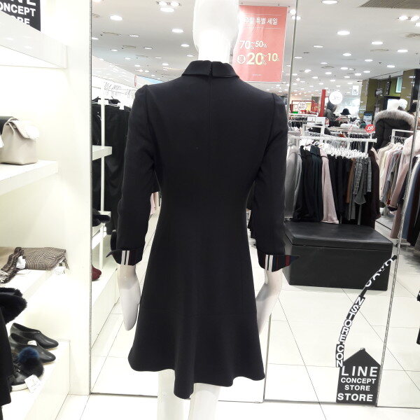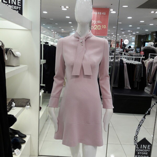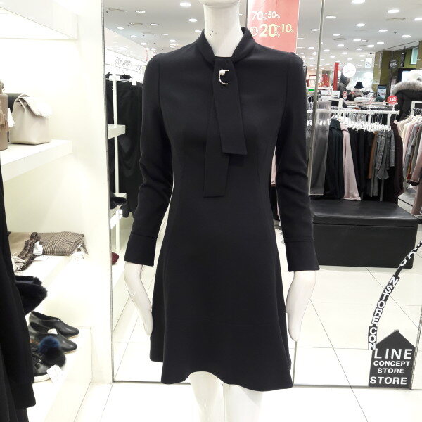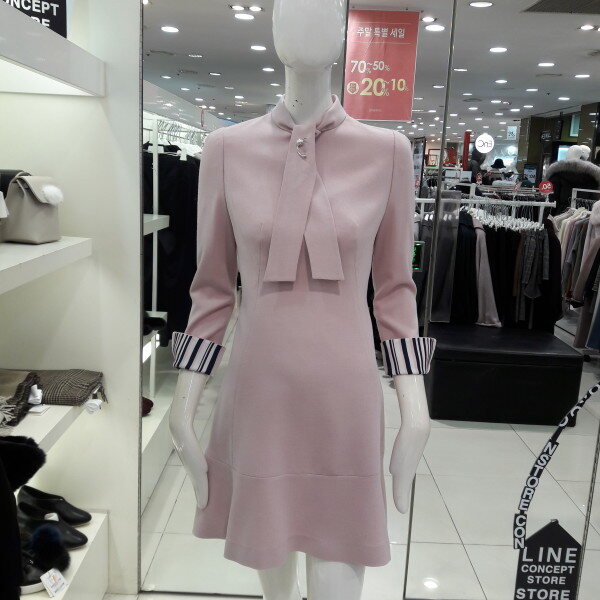 화사사한 칼라감과 넥선의 타이에 장식이 여성스러운 플레어 원피스입니다 슬림한 핏으로 허리라라인이 예쁘며 러블리하게 연출해보세요