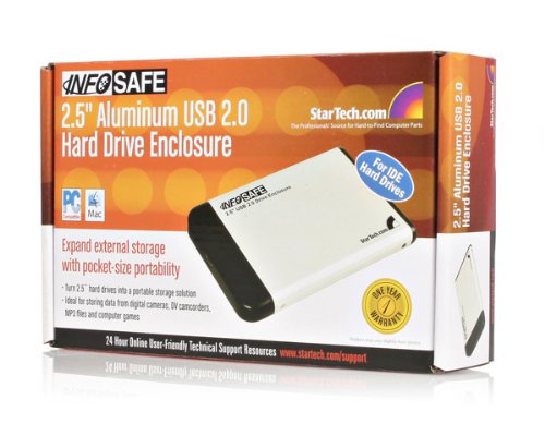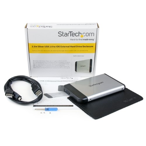 -. Binding : Personal Computers -. Brand : StarTech -. Color : Silver -. Department : accessories general -. EAN : 0065030823647 -. Feature : A compact, aluminum chassis construction makes for a light-weight and easily portable storage solution with optimal heat dissipation characteristics / USB 2.0 transfer rates up to 480 Mbps and ability to draw power from up to two USB ports, means fast access without reliance on an external power source / Backed by a StarTech.com 2-year warranty and free lifetime technical support / Light-weight, durable aluminum construction / High Speed USB 2.0 compliant host interface, with transfer rates up to 480 Mbps / Power/activity LED / Compatible with PATA (IDE) 66/100/133 Mbps drives / Supports 2.5" form factor IDE hard drives -. IsAutographed : 0 -. IsMemorabilia : 0 -. Label : STARTECH.COM -. Manufacturer : STARTECH.COM -. Model : IDE2510U2 -. MPN : IDE2510U2 -. NumberOfItems : 1 -. PackageQuantity : 1 -. PartNumber : IDE2510U2 -. Platform : Windows -. ProductGroup : CE -. ProductTypeName : COMPUTER_DRIVE_OR_STORAGE -. Publisher : STARTECH.COM -. Studio : STARTECH.COM -. Title : StarTech.com 2.5-Inch Silver USB 2.0 to IDE External Hard Drive Enclosure (IDE2510U2) -. UPC : 012302234953 -. Warranty : 2 year warranty