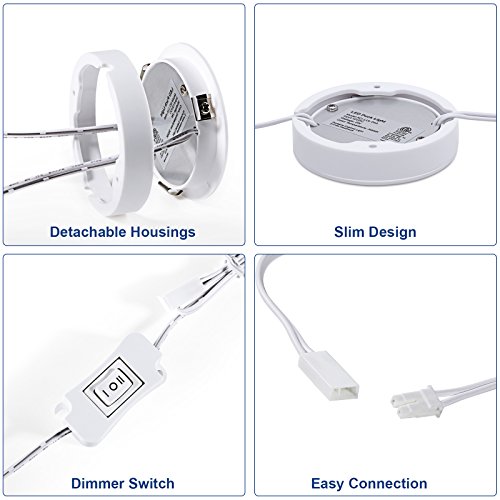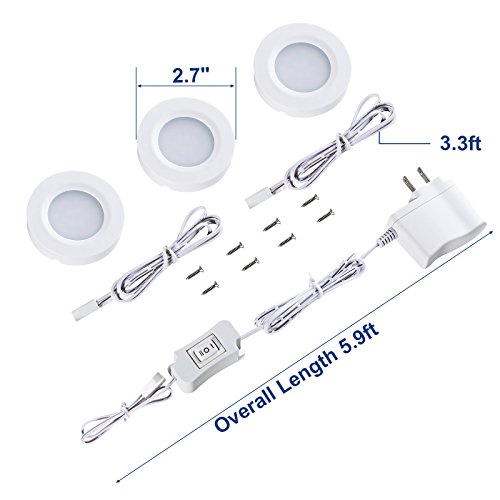 - FLEXIBLE CONNECTION: Special designed 1ft connecting cable on both sides of the puck lights, 6ft power cord and 2 extension cords (3.3ft) give much flexibility to expand the lights as you needed